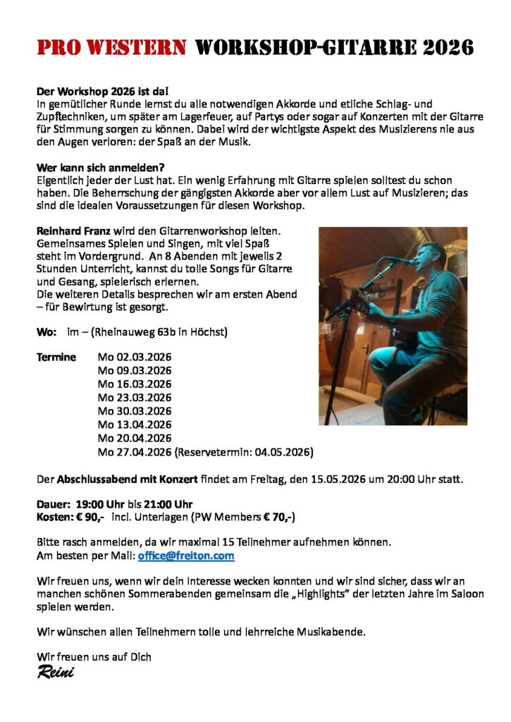Gitarrenworkshop 2026 Veröffentlicht am 16. Februar 202627. Februar 2026 von Vize „Vereinsveranstaltung intern“ 8 Abende mit Reinhard Franz, tolle Songs für Gitarre und Gesang!